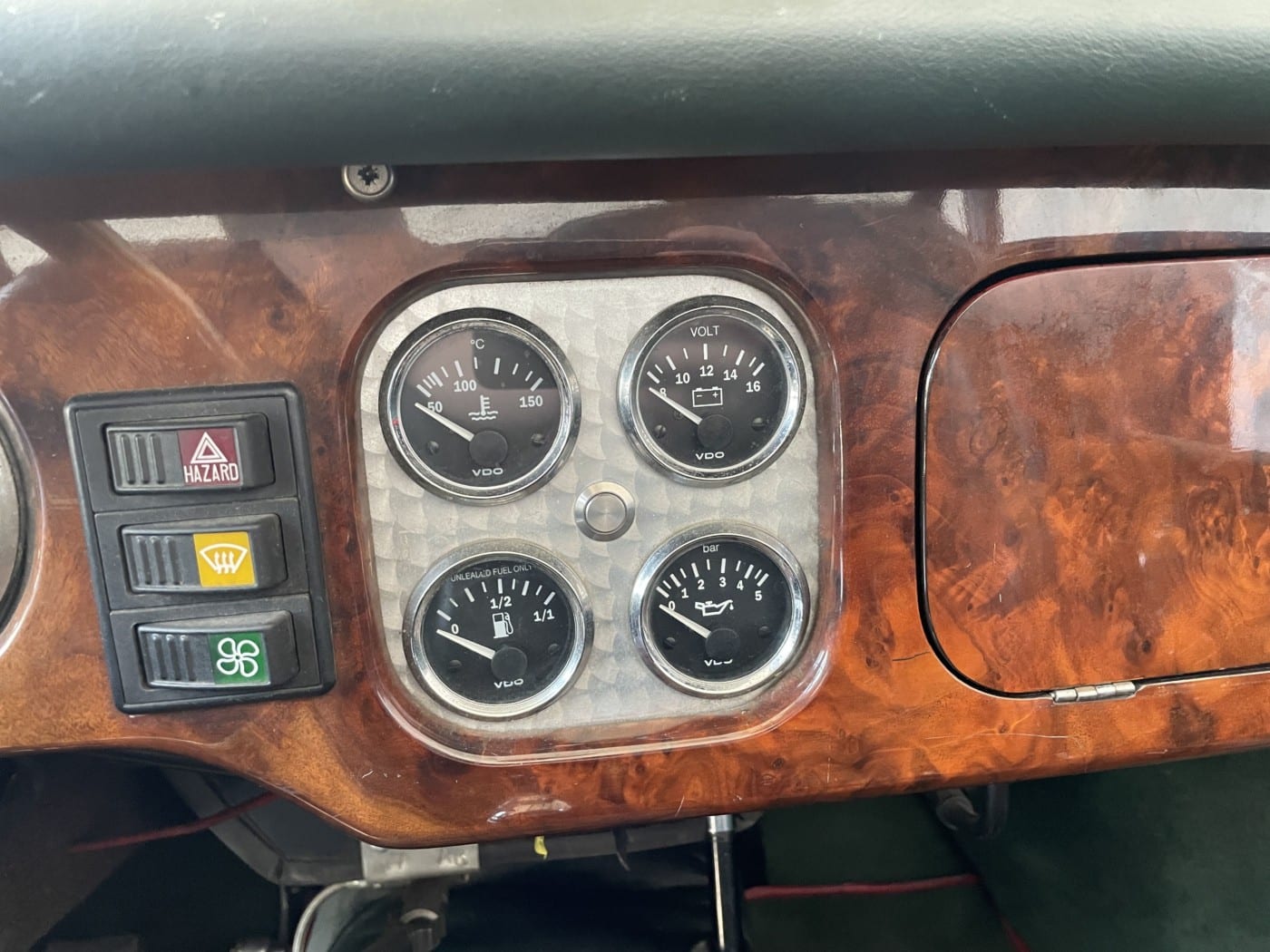 L'intérieur de cette Morgan est dans une bonne patine. On note toutefois la partie du tableau de bord en cuir, au niveau du volant, qui est abimée. La voiture possède ses portes, son tonneau cover (spécial RollBar), ainsi qu'une capote en parfait état.